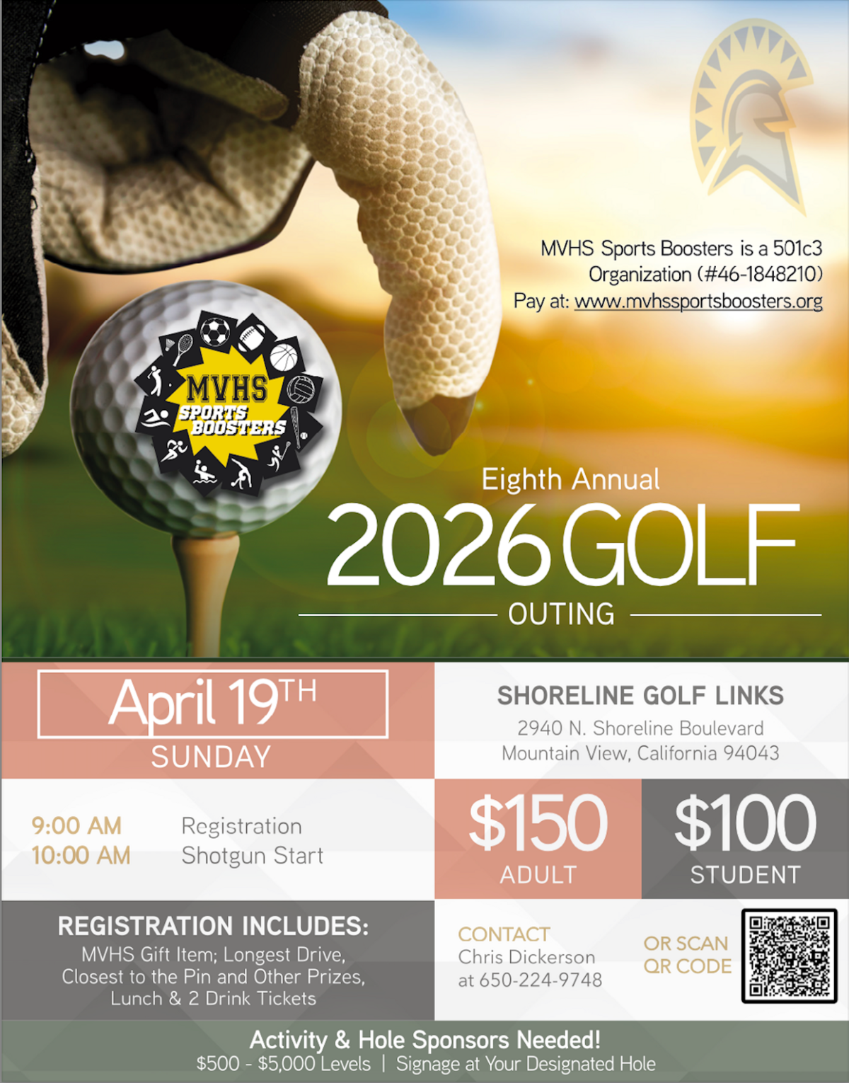 Join us for the 8th Annual Golf Outing on Sunday, April 19 at Shoreline Golf Links—a fun day on the course that also raises money to support MVHS athletics through the Sports Boosters. Your registration (and any hole sponsorships) helps fund programs, equipment, and team needs across our sports. Registration includes lunch, prizes, and two drink tickets. Cost is $150 for adults and $100 for students. Register here, or contact Chris Dickerson with questions at (650) 224-9748.