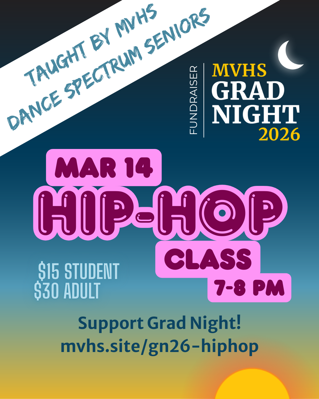 Looking for something fun? Come join us for a Hip-Hop Night taught by our very own talented Dance Spectrum Seniors! Grab your friends, this class is open to EVERYONE and sure to be a hit. Sign up at mvhs.site/gn26-hiphop today! Proceeds support Grad Night.