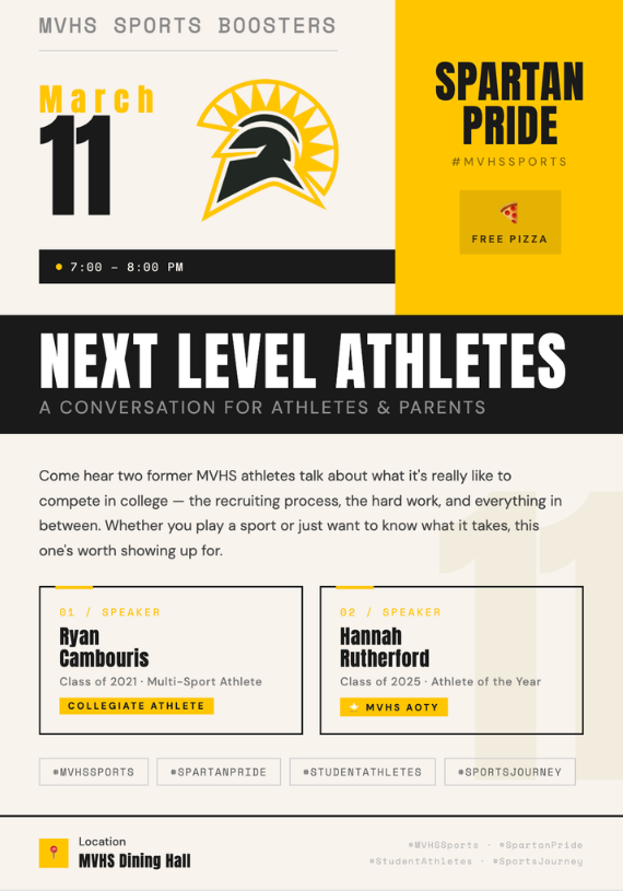 Join us for a special evening featuring a moderated conversation with two former multi-sport MVHS athletes, Ryan Cambouris (‘21) and Hannah Rutherford (‘25; MVHS Athlete of the Year), who will share their journeys through high school sports and life as collegiate athletes. Hear firsthand about commitment, challenges, recruiting, and what it really takes to compete at the next level.