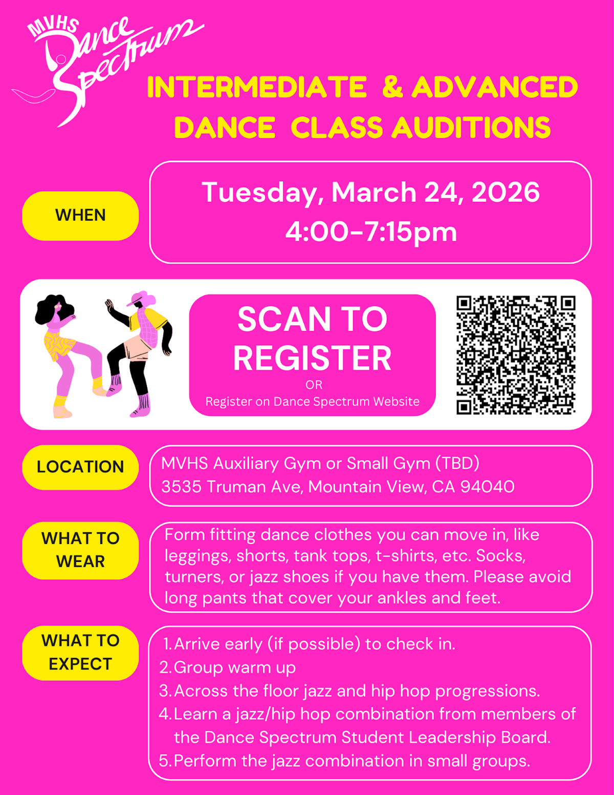 More information regarding in person and video auditions can be found on the Dance Spectrum Website. Please email Lauren Kato at lauren.kato@mvla.net with any questions.